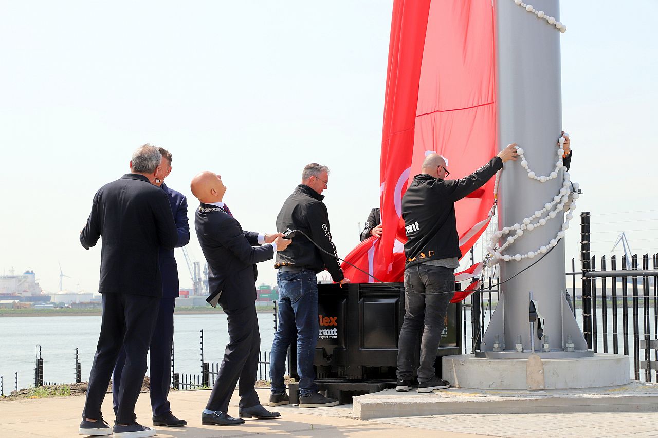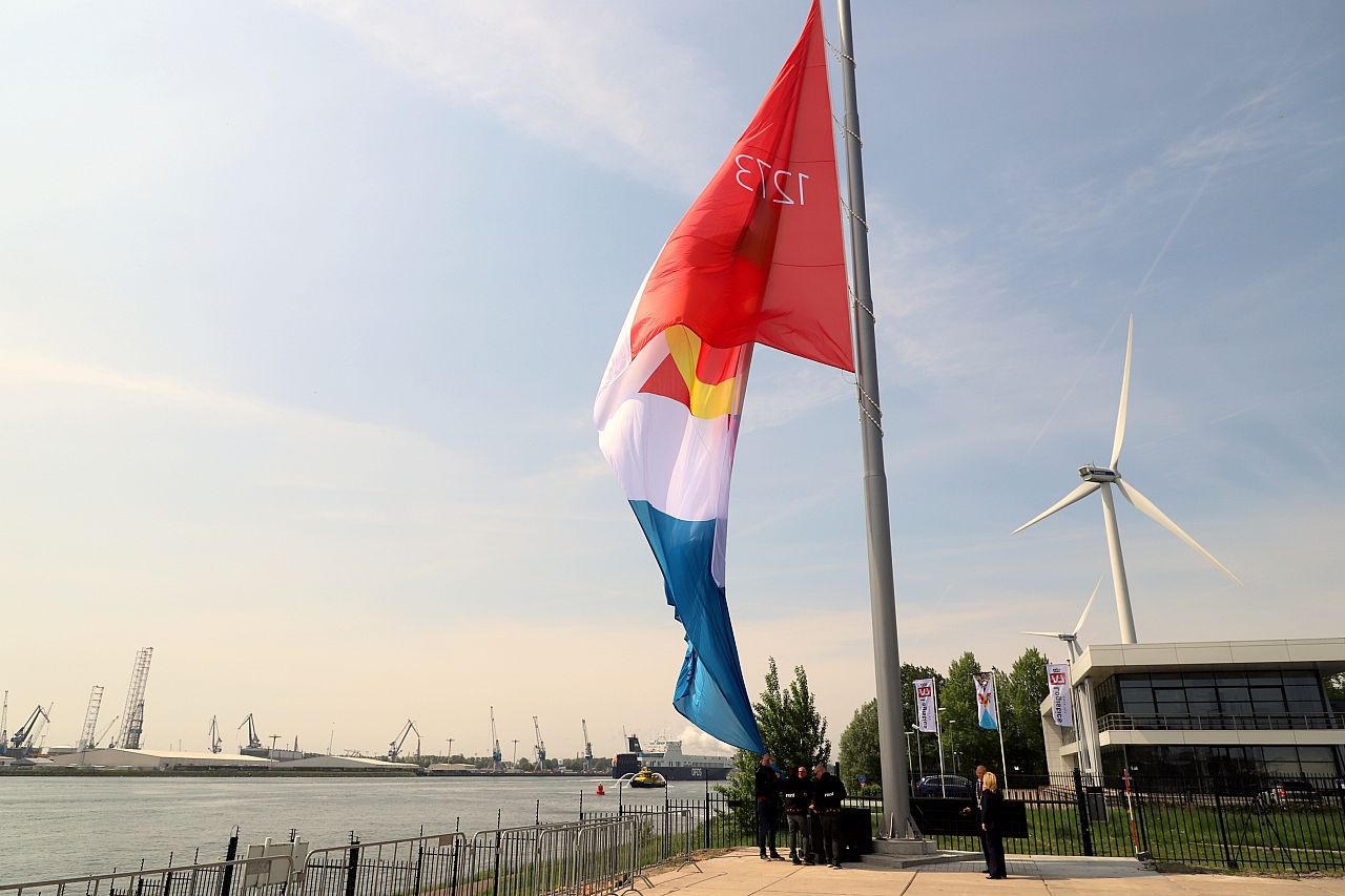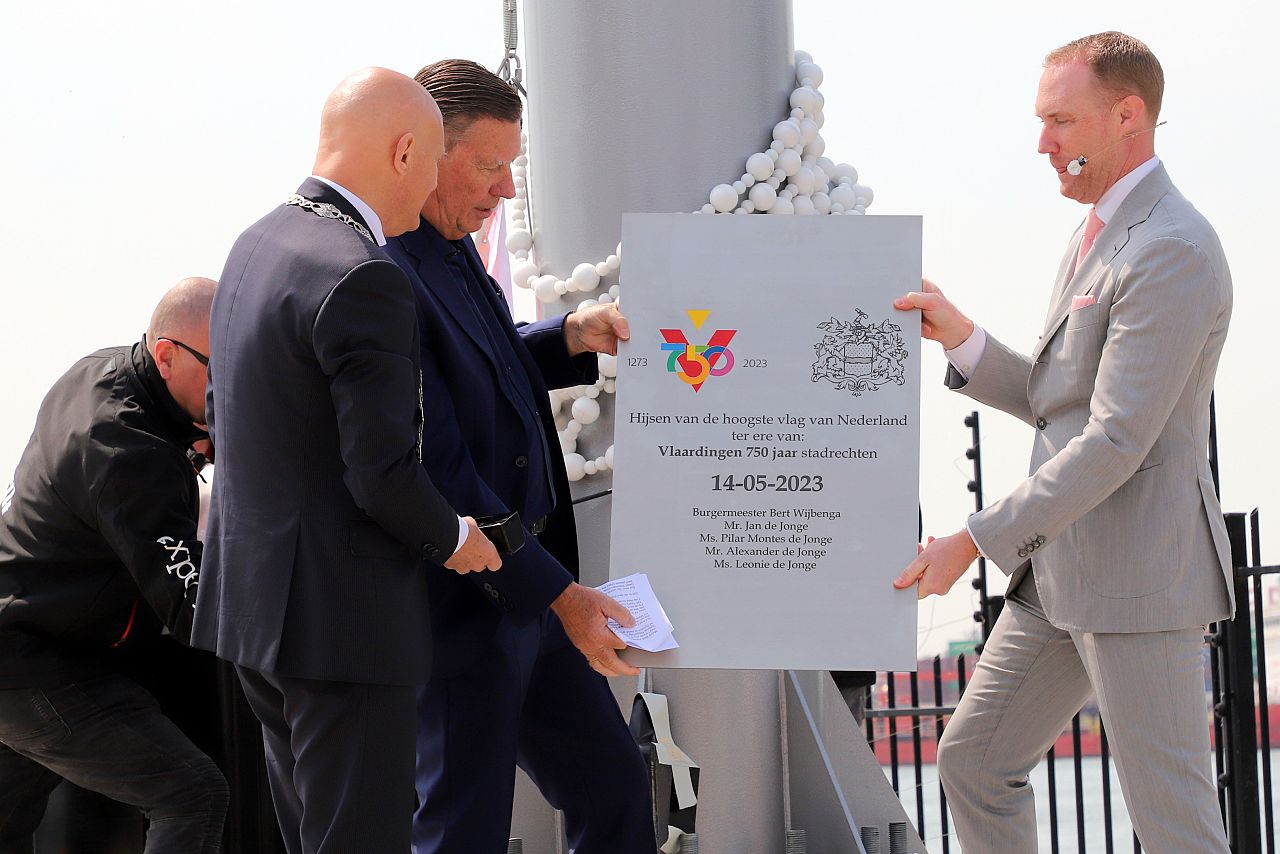 Jan de Jonge - van J. de Jonge Group - vond het mooi om 750 jaar stadsrechten te combineren met de onthulling van hun nieuwe locatie aan de Koggehaven. Het oer-Vlaardingse bedrijf besloot zichzelf en de stad een cadeau te geven in de vorm van de hoogste vlaggenmast van Nederland. Samen met burgemeester Bert Wijbenga-van Nieuwenhuizen hees Jan de Jonge op 14 mei 2023 een indrukwekkende Vlaardingen-750-vlag van 12 bij 18 meter in de 40 meter hoge mast.